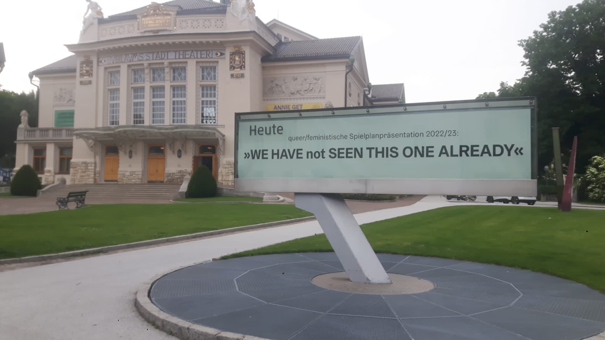 2022 WE HAVE not SEEN THIS ONE ALREADY Intervention als Pressekonferenz am Stadttheater Klagenfurt innerhalb der Langen Nacht der Frauen Juni 2022. Von und mit Katrin Ackerl Konstantin, Dušana Baltić, und Lea Friesner.